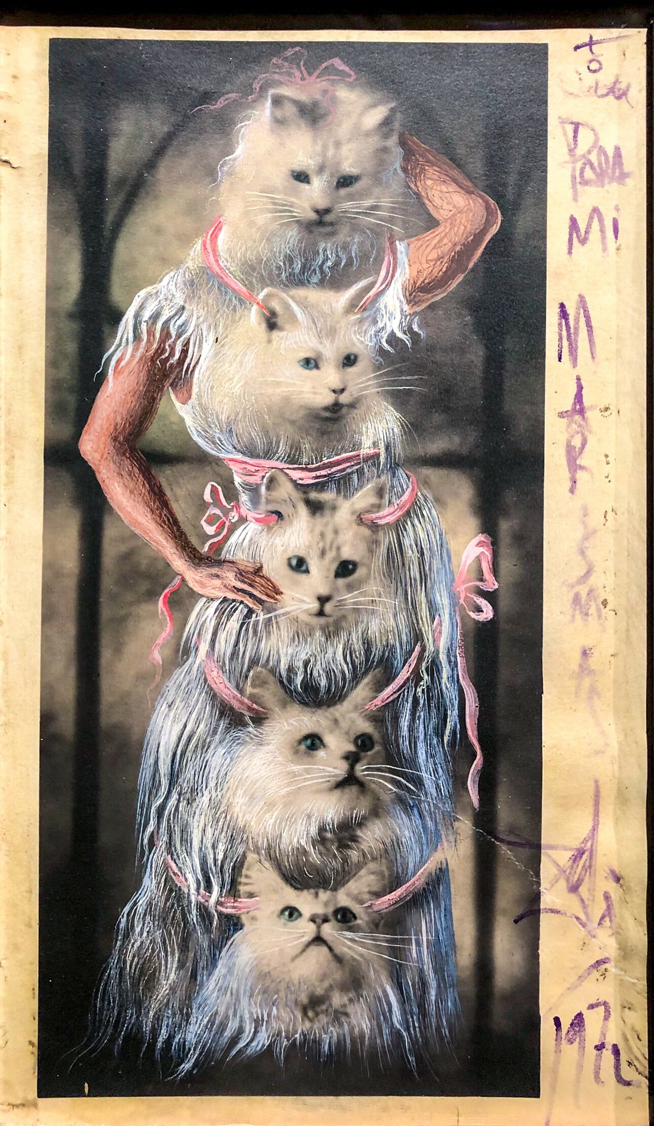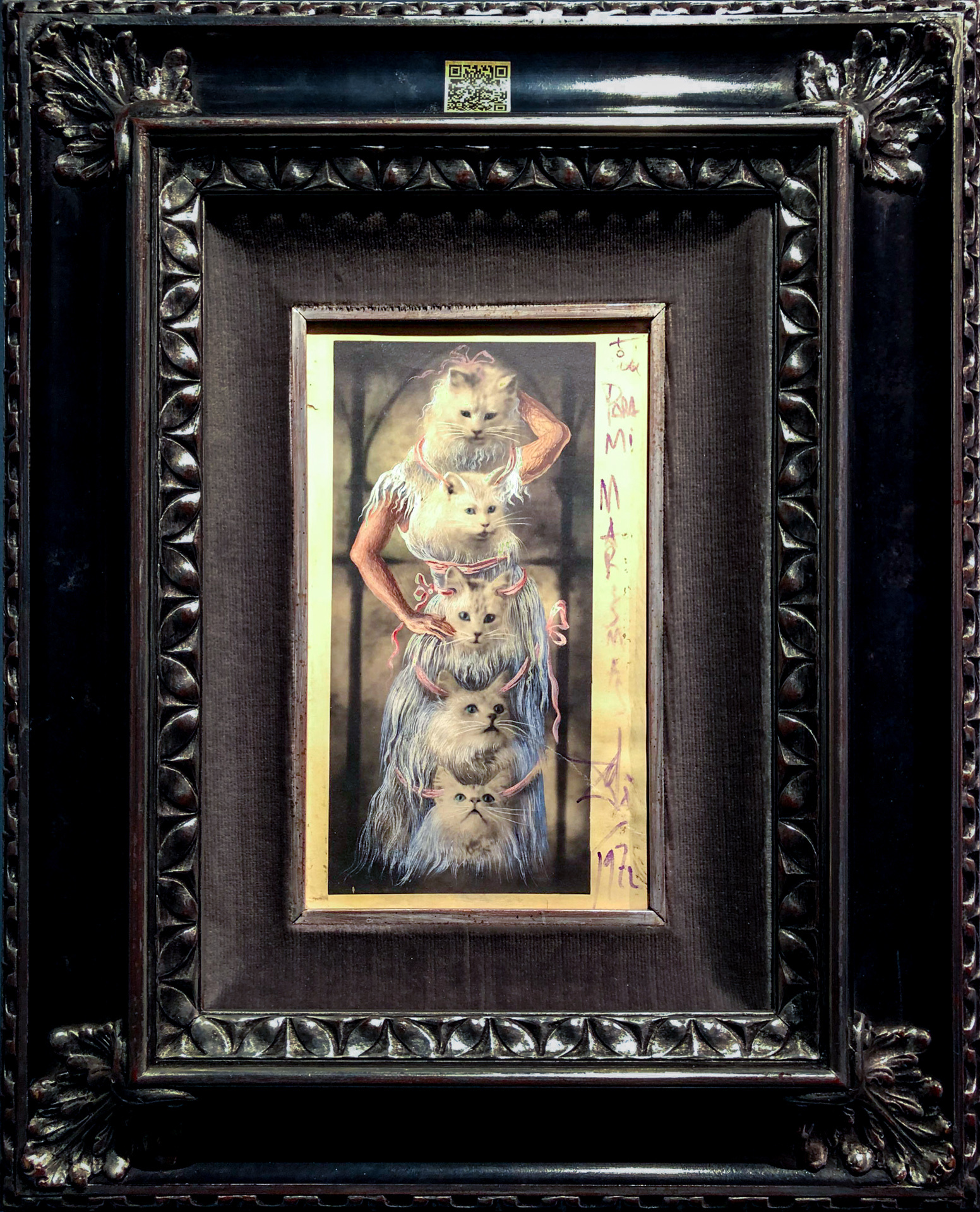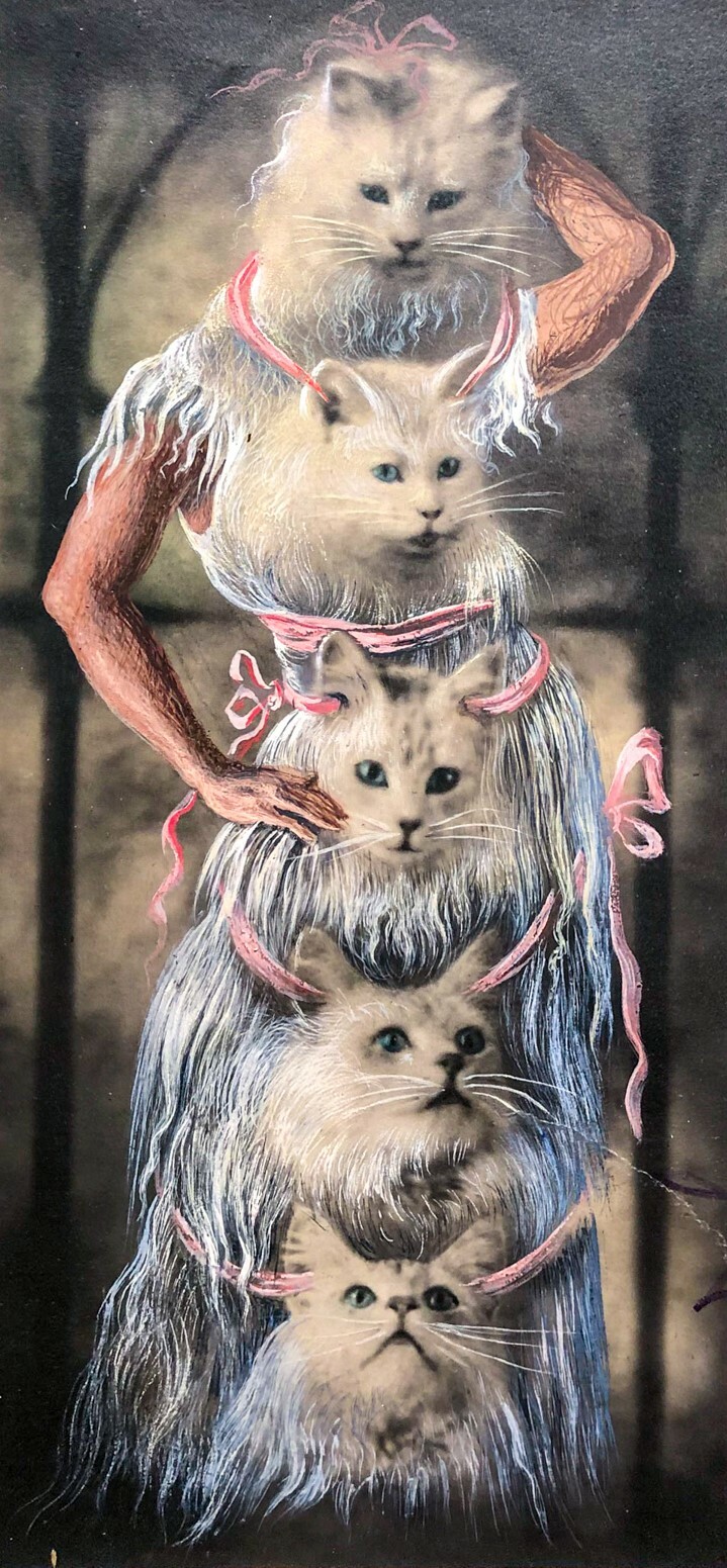 «Работа «Девушка кошка» 1950 года - яркий образец, квинтэссенция творческого гения эксцентричного испанского мастера-сюрреалиста Сальвадора Дали. Картина была создана в продолжении цикла работ после знаменитой «Атомной Леды» (1945-1949) и фотографий Филиппа Халсмана «Атомный Дали» с картиной «Атомная Леда» и тремя парящими кошками». Образ одной красивой девушки-кошки на картине составлен из других образов, отсылающих к способности женщин к мгновенным перевоплощениям и непрерывному изменению мира, в котором нет статичного состояния. Возможно, в образе женщины-кошки художник изобразил свою русскую супругу Галу (Елену Дьяконову). Этот коллаж объединяет фотографию, искусство кинематографии, лаконично интерпретирует женскую натуру».